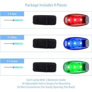 🧿Package Includes 9 Pieces And Three-Color;3 X Red 3 X Blue 3x Green, Each Lamp With 2 Batteries Inside, 9X Mini Screwdriver (For Easily Opening The Back) 9X Adjustable Velcro Straps For Mounting, Attaching The Light To Children's Scooters/Bike Posts, For Headlight Or Tail Light, Dog Collars, Leashes, Helmets Etc.