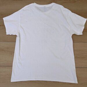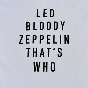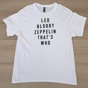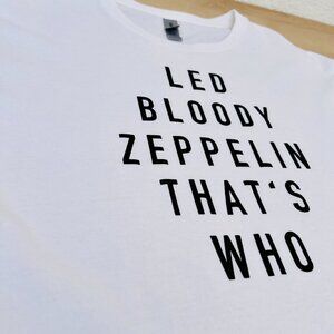 Pre-owned, still in good used condition, Led Zeppelin White T-Shirt "LED BLOODY ZEPPELIN" Unisex Size Large. Inspired by the famous photo taken at Knebworth Festival in '79 of a fan wearing the same shirt but with the words printed on the back. The words are printed in the same block black letters but on the front of this Tee.