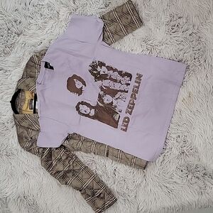 Lavender purple with brown print. Some mark upper left shoulder/chest area - zoom on pics. Has been laundered so not soiled.