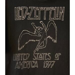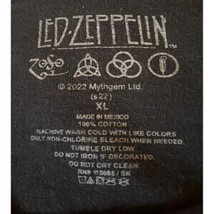 Pre-owned, the front of this 2022 Zeppelin shirt displays the well known and favorite logo, the Swan Song Icarus graphic from the band’s 1977 tour. This modern, recent reproduction is an officially licensed product by Mythgem Ltd and was made in Mexico.