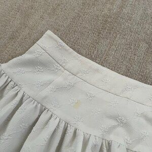 A white bubble hem mini skirt with gathered floral applique and embroidered design. Tagging a M because it measures like it might run small