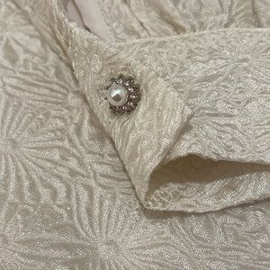 Details: full lining, floral embossed fabric, pearl and Chrystal buttons