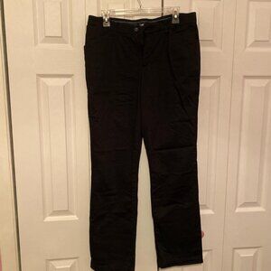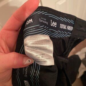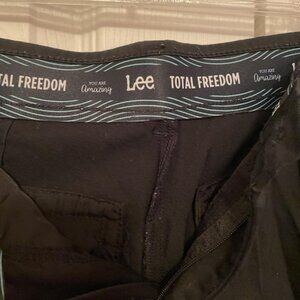 Lee Total Freedom button-up black straight leg trousers. Zip/button style with real front and back pockets. Medium/regular length. Stretchy and comfortable but not thin