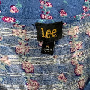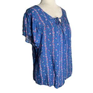 Lee Boho Flutter Sleeve Peasant Top M Blue Floral Rayon Tie Neck Bohemian