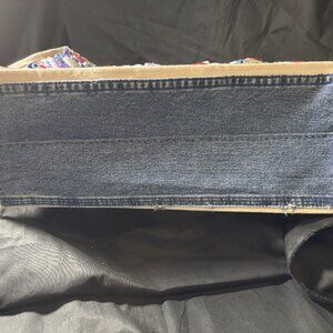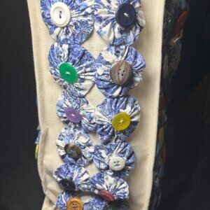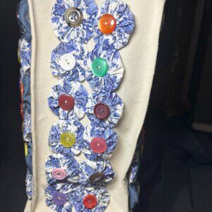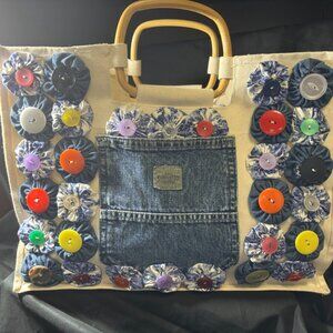 This unique bag is made by Lee Dungarees, the makers of Lee jeans. It's made of canvas and features several different size and colors of buttons. There is a small pocket on the outside front and back made of denium. The handles are wood. The height is 11.5 inches, the length is 15.5 inches and the width is 5.5 inches.