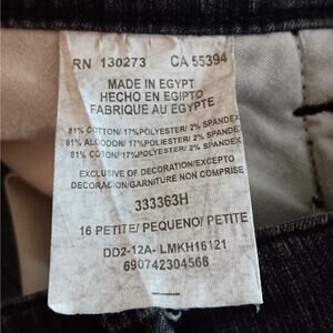 They are a size 16 petite and measure approximately 18 inches at the waist lying flat, 13 inches at the rise, a 15 1/2 inch inseam, and 8 inches at the leg opening with a 2 1/2 inch slit.