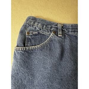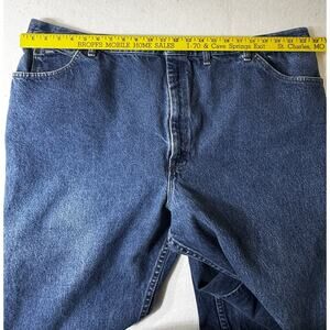 Vintage Lee Jeans for men in size 48x32, featuring a classic straight leg style in blue denim. This western cowboy-inspired design from the 80s or 90s includes a logo accent, 5-pocket design, and a mid-rise fit. Made of machine washable cotton with a dark wash, these jeans are perfect for all seasons and offer easy care. The timeless appeal of these Lee jeans makes them a must-have for any wardrobe.