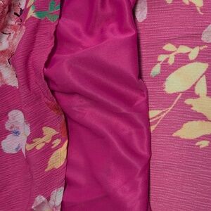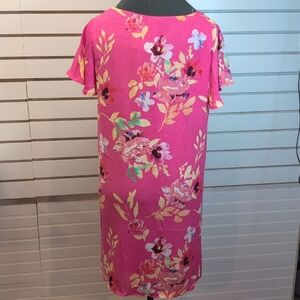 Sweet and easy bright pink floral shift dress with flowy cap sleeve. Fully lined and easy to wear!