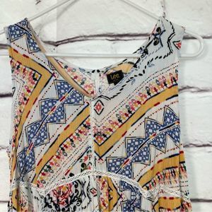 Lee Lightweight Loose Tank in Size Large. It has lace trim and a high-low hem. The print includes white, black, green, and orange. Perfect for a hot summer day!