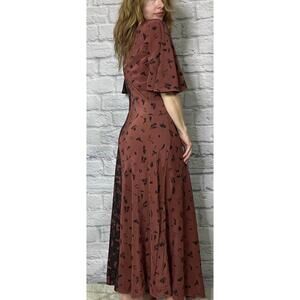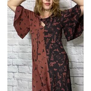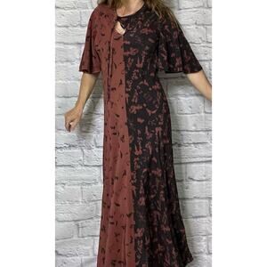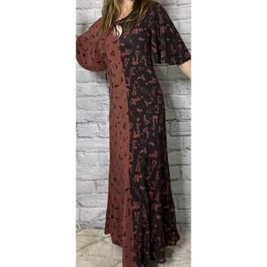 Timeless elegance awaits with this Lee Mathews 'Amalia' Silk Maxi Dress. Featuring a unique neckline with an asymmetrical keyhole, this dress exudes sophistication and charm. It's a journey in contrasts- the yin and the yang. Each side an exact opposite mirror image of the color scheme in oxblood and charcoal. The butterfly sleeves exude femininity and accentuate the flowy design. Perfect for special occasions or adding a touch of luxury to your everyday style.