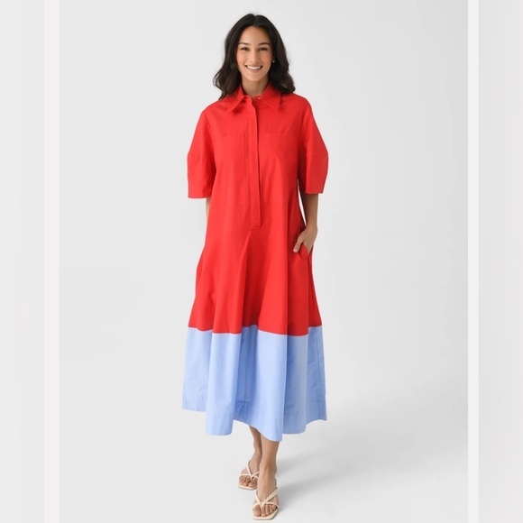 Elevate your wardrobe with this stunning Lee Mathews Wendy Shirt Dress, a designer statement piece known for its minimalist aesthetic and bold colorblock design.