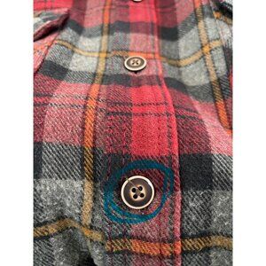 Warm and rugged Lee men’s flannel shirt jacket featuring a red, gray, and black plaid pattern with subtle gold accents. Crafted with a soft brushed flannel shell and cozy waffle-knit lining for added warmth and comfort. This versatile piece can be worn as a heavy shirt or lightweight jacket—ideal for layering through the fall and winter seasons. Details include a full button front, two button-flap chest pockets, adjustable cuffs and pockets. One button is slightly chipped, but extras are included if the buyer wishes to replace it; this does not affect wear or function.