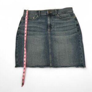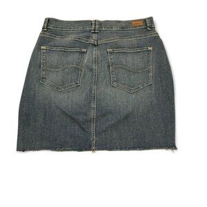 Lee Mini denim skirt with raw hem. No size listed. Measurements in photos. Material has some stretch.
