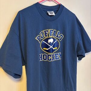 Lee Sport NHL Buffalo Sabres Hockey Short Sleeve T Shirt with Blue and Gold Yellow Logo in Mens Size XL. Gently used and in excellent condition.