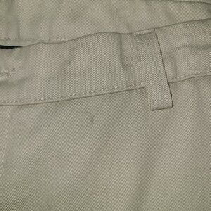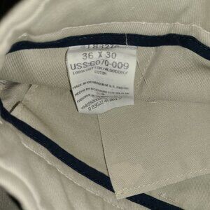 Gently used khakis by Lee size 36 x 30. No holes but there is a small spot on the front left under the waistline (see pic). 100% cotton, belt loops, 4 pockets, zipper/button closure.