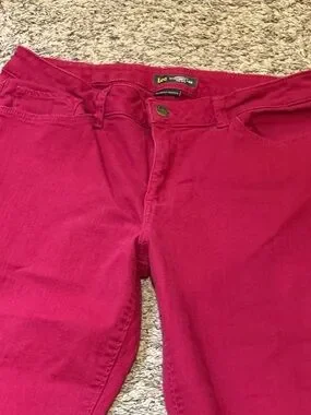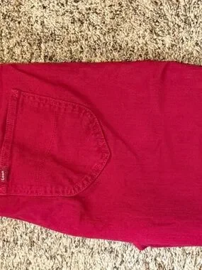 Lee straight-leg pants in a rich raspberry red. Metal Lee logo button detail. Clean silhouette with visible stitching. Versatile bold color for styling.