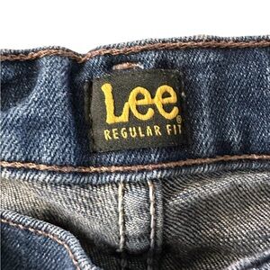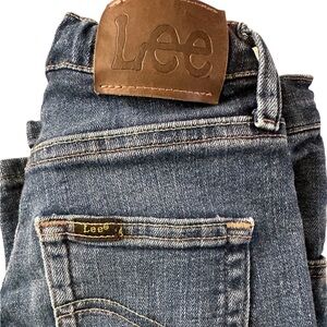 A classic blue straight leg jean with distressed coloring along the thighs, interior tightening elastic band, 5 pockets and a logo leather patch on the rear waist.
