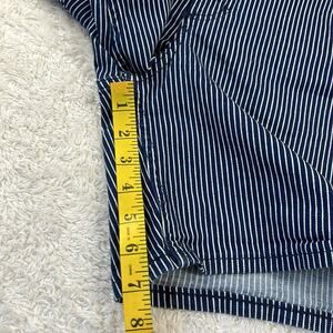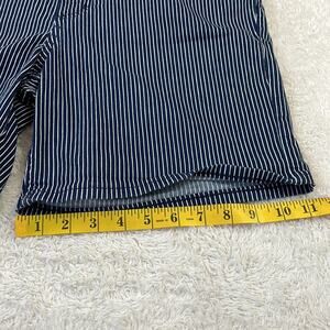 Navy blue and white pinstripe shorts with front button and zip closure, and traditional 5 pocket cut. Mid-rise, with a waist of 34". No size or fabric tag, and they do have a bit of stretch.