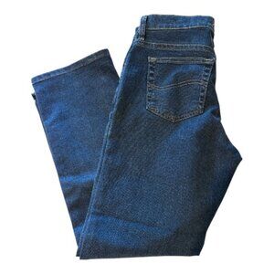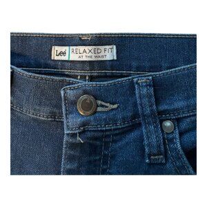 Blue denim jeans with straight legs, pockets and button and zipper enclosure.
