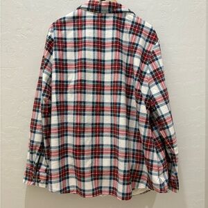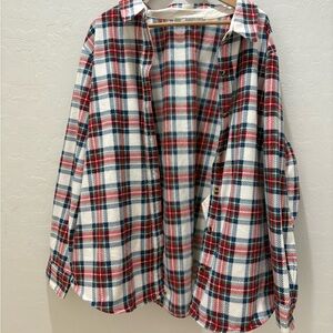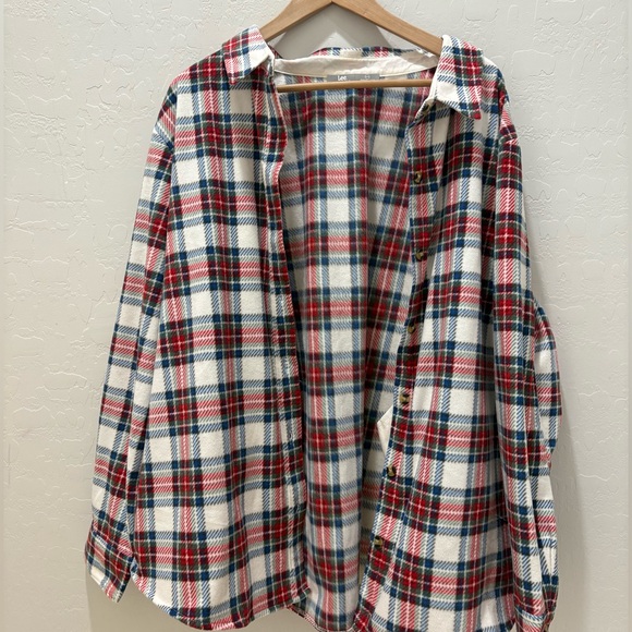 Stylish plaid fleece flannel shirt featuring a classic red, blue, and white pattern. Perfect for fall and colder weather or the outdoors!