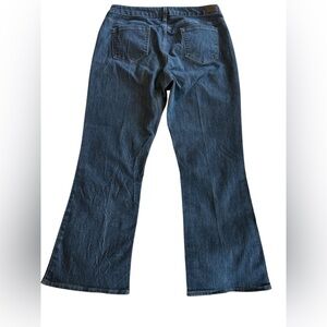 Lee Riders Jeans Womens 16P Mid Rise Bootcut Dark Wash Blue Stretch Denim waist measures 35, inseam measures 28 and the rise is 10.5 inches, leg opening 9.5 inches