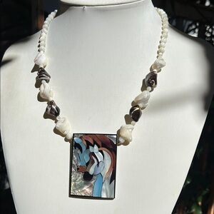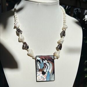 Gorgeous “Lee Sands” handcrafted necklace with an unique shell pendant featuring two beautiful horses with mother of pearl inlaid. The necklace showcases a blend of cream and brown tones, perfect for adding a touch of sophistication to any outfit. It measures approximately 20” long.