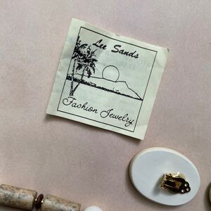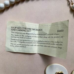 This is a Lee Sands necklace and clip earrings set introduced in the 1980s. This leopard ceramic necklace and clip earrings were designed by Lee Sands for QVC and made in Japan. The necklace has a lobster claw closure and the earrings are clip. Beautiful set! A crafty person could probably pull the clips off and glue pierced pins on.