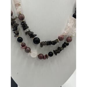Two-fold bold! This striking double-strand necklace is designed with the contrasting colors of rose quartz, smoky quartz, and rhodonite free-form nuggets accented with round rhodonite, rose quartz, black glass, and goldtone beads. A carved rhodonite rose pendant on the side of the necklace connects the two strands, while round black glass beads finish the look at the ends. From Lee Sands.