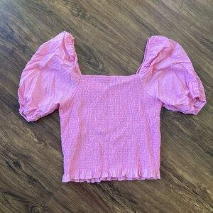 Chic Lee blouse with smocked texture. Soft pink hue. Perfect for casual wear. Women’s large