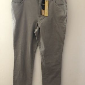 Sits above the waist, eased in the seat and thigh, straight leg five pocket styling