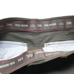 Lee's Total Freedom Men's Shorts in size 34, olive green. Designed for casual outdoor work with a stretch waist for comfort, and made from durable cotton and spandex blend.