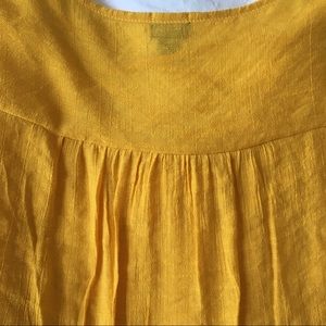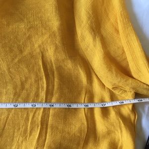Lightweight, linen feel. Rich gold color. Crisscrossing hemline & detailing at neck. Ruching along mid-back. Mother of Pearl buttons at sleeves.