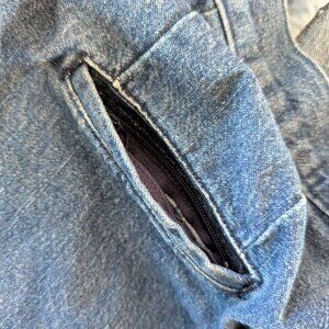 Vintage classic denim pencil skirt with 4-pocket design. Button and fly closure. Back pockets have zippers.