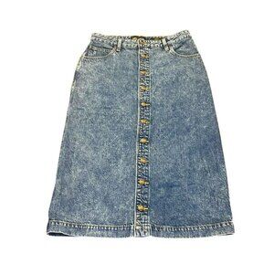 The Lee Vintage Modern High Rise Midi Denim Skirt in size 32 is a stylish piece perfect for a Western 80s or grunge look. Made of durable cotton denim fabric, this skirt features a solid blue acid wash color with a button closure and logo accents. The high rise waist and straight pencil style make it versatile for various occasions, from casual outings to parties. With a midi length and pockets for added convenience, this skirt is a must-have for any fashion-forward woman looking to add a touch of retro flair to her wardrobe.