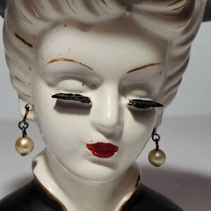 Vintage Lee Wards lady head vase. Glamour girl with black outfit and hat. Gold bow. Faux pearl earrings. Some areas of paint loss. Manufacturers defects. Approximately 4.5" tall. Prior owner wrote on the bottom. See all pictures.