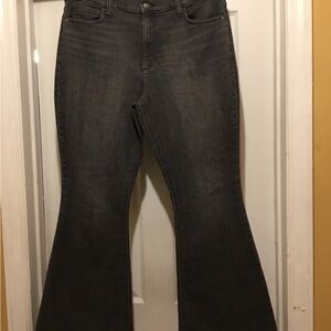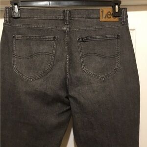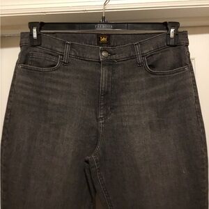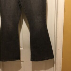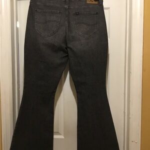 Chic charcoal flared jeans by Lee. Perfect for stylish outings. Waist measures 36 inches and inseam measures 30 inches. Bottom width of leg is 12 inches.