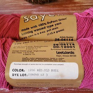 LeeWards Orlon Sayelle Yarn - Med. Old Rose 4-oz - Bundle of 2 - 8 Oz Total This listing and price is for 2 skeins. Each Skein 3 oz - total 6oz Weight Verified Weight Aran (8 wpi) ? Wraps per inch Yardage 200 yards (183 meters) Unit weight 113 grams (3.99 ounces) Gauge 18.0 sts = 4 inches Needle size US 8 - 5.0 mm Hook size 5.5 mm (I) Fibers 100% Manufactured Fibers - Acrylic Texture plied Machine wash? yes Orlon is a trademarked name for acrylic fiber.