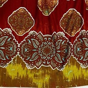 Colors are in shades of red, chartreuse, teal, bronze, and white