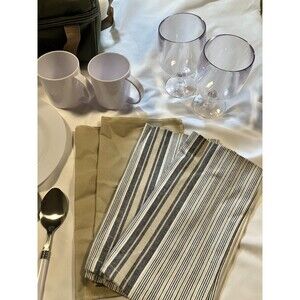 Enjoy the great outdoors in style with the 11pc Cafe Picnic Backpack for Two. The main compartment has a wide opening to easily access the picnic pieces. The separate PEVA insulated cooler storage compartment fits 6 cans. Set includes 2 each: 8'' plates, mugs, wine glasses, forks, spoons, and napkins. Perfect for tailgating, a trip to the park, and everything in-between!