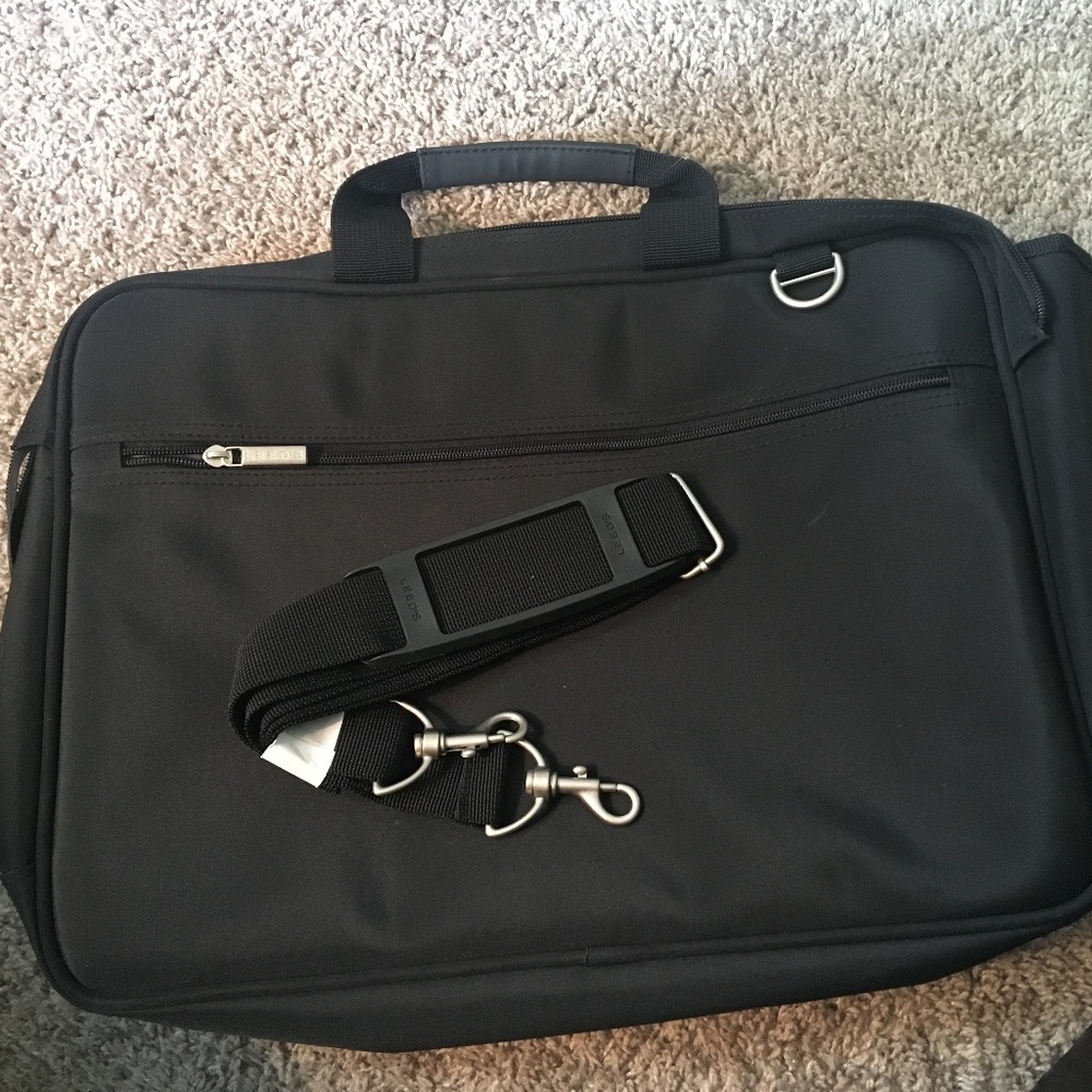 Zippered pockets outside front & back. Front has a zippered deluxe front organizer that can hold multiple business accessories. Padded interior laptop compartment holds most computers up to 15". Additional pocket in Interior, as well as open mesh pockets to hold accessories. Detachable, adjustable shoulder strap.