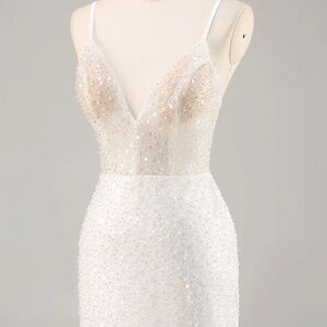 The sparkly white mini dress is the perfect choice for celebrating your big day in style. This stunning dress features a flattering bodycon silhouette that hugs your curves, while the V-neckline adds a touch of elegance. Adorned with shimmering sequins, it catches the light beautifully, ensuring you stand out in any setting. The mini length showcases your legs, making it ideal for pairing with stylish heels. Crafted from high-quality materials, this dress combines comfort with glamour, allowing you to dance the night away with confidence. Make unforgettable memories as you embrace this exciting new chapter of your life in this eye-catching graduation dress!
