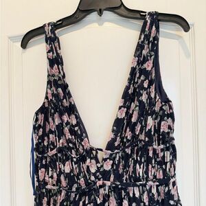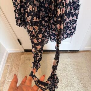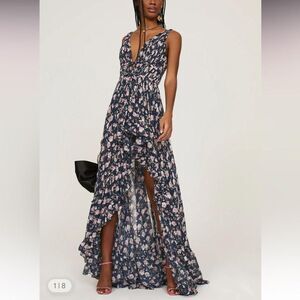 Leena for Mac Duggal Floral Ruffled Gown Tear on hemline see video and pictures A corded waist and daring drop back give a beautiful silhouette to this elegant gown by Ieena for Mac Duggal. Materials and Measurements: Blue floral chiffon (100% Polyester). A-line. Sleeveless. Plunge neck. Back zipper closure.