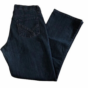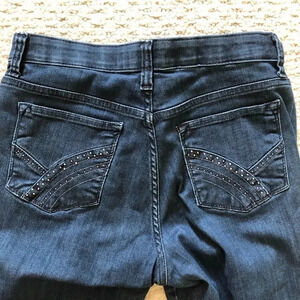 Lee the most comfortable high waisted, wide leg, slight flair dark wash jeans with silver studs on the one side pocket and on both back side pockets size 8 medium. In excellent used condition