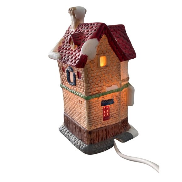 Charming ceramic village house with a quaint grocer shop design. Features a light-up interior to enhance its rustic multicolor aesthetic. Includes a corded light bulb insert.