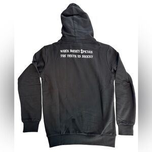 Stylish black hoodie featuring a unique graphic design. Perfect for casual wear. This hoodie is made by left point size small brand new. Please look at all the pictures have any questions or comments sent them to me. Thank you. FYI the front picture is all bling -bling.