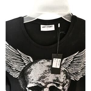 Edgy meets elegance in this stunning Left Point New York graphic tee! This black crew neck t-shirt features an eye-catching skull design adorned with dramatic silver wings created with intricate rhinestone detailing. The embellished graphic has a gorgeous textured look that catches the light beautifully.