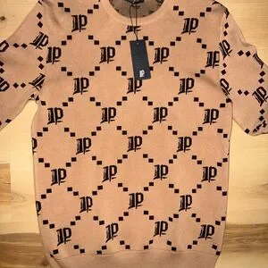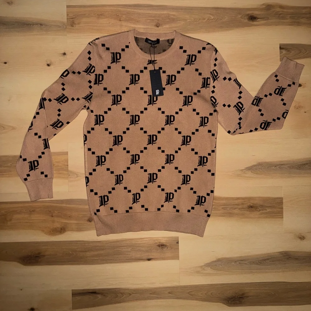 Stylish tan crewneck sweater with an all-over black logo pattern. Soft knit fabric offers comfortable, everyday wear. Ribbed cuffs and hem provide a clean, tailored fit. Versatile piece that pairs well with jeans or chinos.l