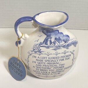 Left-Handed Ceramic Pitcher With Blue & White Nautical Design 5"