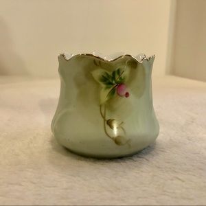 Lefton China hand painted Heritage Green jam / jelly bowl. In very good used condition. Missing lid, underplate & spoon. Small wear on lower ‘bubble’. Greenish background, w/floral pattern in pinks, greens, browns. Gold tone edge at top. Measurements approximate. Diameter at top edge to edge 2 7/8 in. Diameter of opening at top of circle 2 in. Diameter of base 2 5/8 in. Height 3 in. Width 3 1/4 in. Color not as dark / yellow as shown. 1205 M4