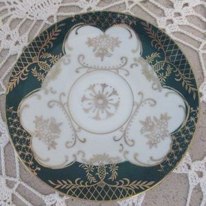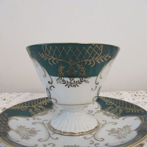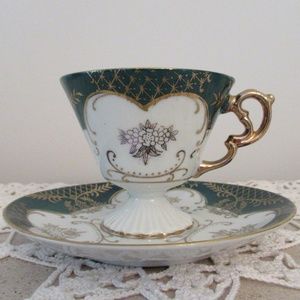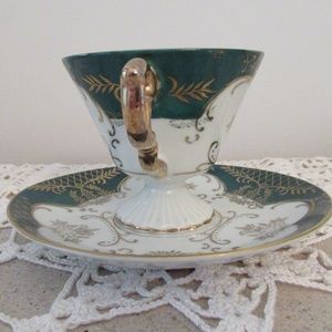 Rare Vintage Lefton China tea cup and saucer hand painted; Reg US patent off. Green and white pattern with gold gilding, handle gold gilded